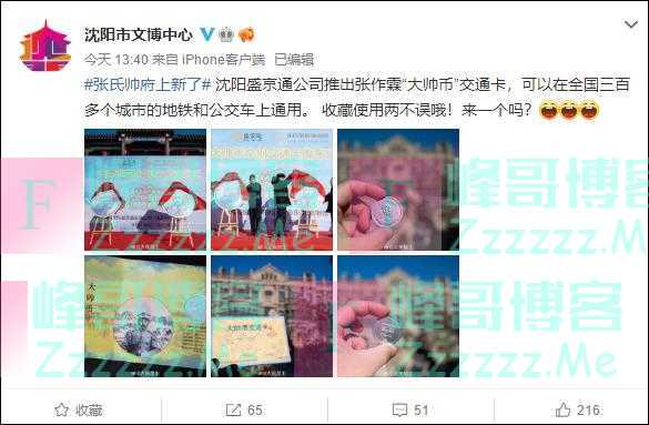 @沈阳市文博中心 1月19日消息,沈阳盛京通公司推出张作霖“大帅币”交通卡,可以在全国三百多个城市的地铁和公交车上通用。