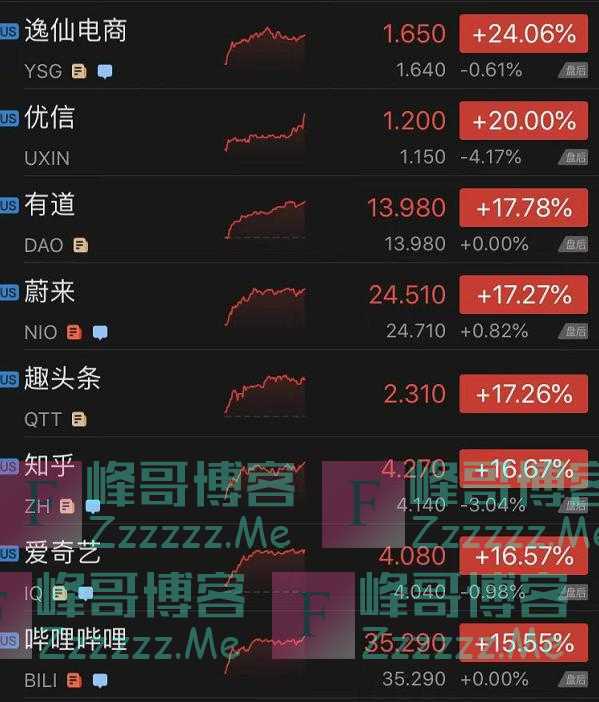 其他中概股中,逸仙电商收涨逾24%领跑,达达集团涨近19%,网易有道、蔚来汽车、趣头条涨超17%,瑞幸咖啡、知乎、爱奇艺涨超16%,B站、贝壳涨超15%,悦刻电子烟母公司雾芯科技、微博、虎牙涨超12%,腾讯音乐、陌陌、富途证券涨超10%,阿里巴巴、小鹏汽车、百度涨超9%,理想汽车涨近9%,高途教育涨超8.2%,好未来、新东方、网易涨超7%,腾讯ADR涨近6%。