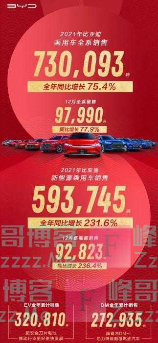 2021全年,比亚迪乘用车销量超过73万辆,同比增长75.4%,其中新能源汽车销量超过59.3万辆,同比增长231.6%,整体销量占比达到81%,问鼎2021年中国新能源乘用车年度销量冠军。