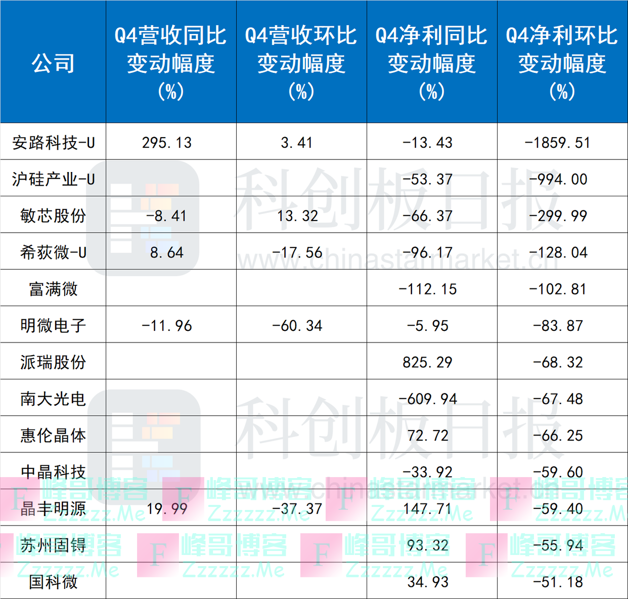 Q4净利环比为负的企业中,安路科技-U、沪硅产业-U、敏芯股份等跌幅较大。