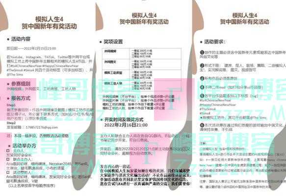 与此同时,也有一些网友自发组织活动,宣传中国春节文化。该活动通过在社交媒体平台上传中国新年主题的《模拟人生4》作品来宣传中国文化,组织者还设置了奖金。在宣传海报上,他们写下了这样一段话:“在中国模拟人生玩家最如鲠在喉的此刻,我们真诚希望大家能参与这次文化输出活动!不论作品青涩还是完美,参加活动意在共同表达坚定保护问过传统文化的信念、意在尝试与EA进行一次真诚严肃的交流,我们需要你!”↓