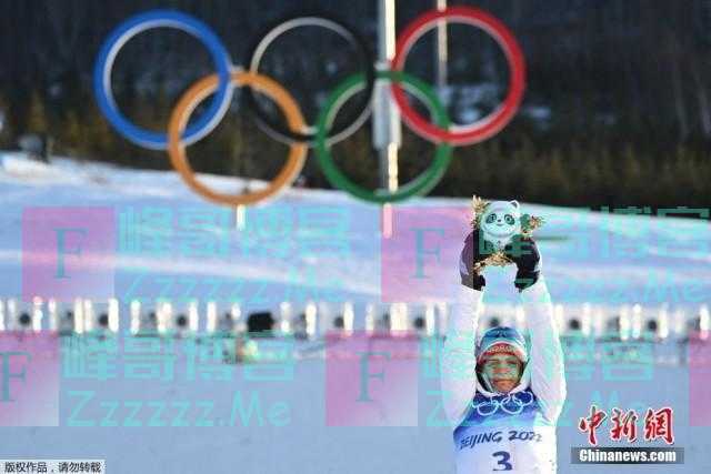 2月5日下午,北京冬奥会首枚金牌在国家越野滑雪中心诞生,越野滑雪女子7.5公里传统式+7.5公里自由式双追逐获得前三名的运动员收获了专属定制冰墩墩纪念品。图为收获金牌的挪威名将约海于格高举冰墩墩庆贺。