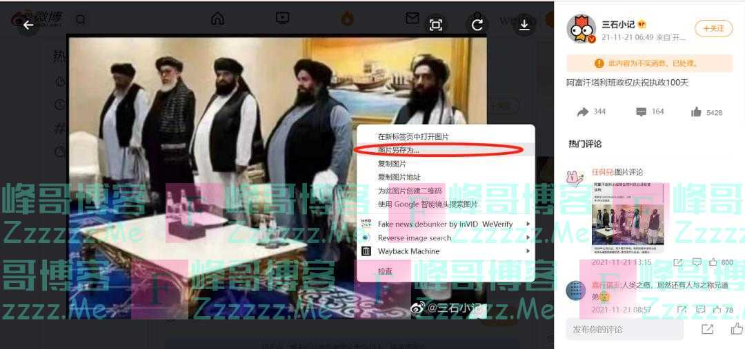 微博截图。要核查这则消息的真伪,可以从图片入手。第一步,需要获取相应图片。我们可以点击消息中的图片,放大后点击右键,将图片“另存为”至本地。