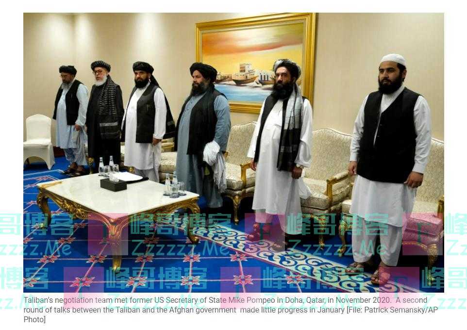 文中图片的下方还有三行说明文字,显示图片由美联社雇佣摄影记者瑟曼斯基(Patrick Semansky)拍摄,展示的是2020年11月21日塔利班谈判代表与蓬佩奥在卡塔尔首都多哈见面的画面。
