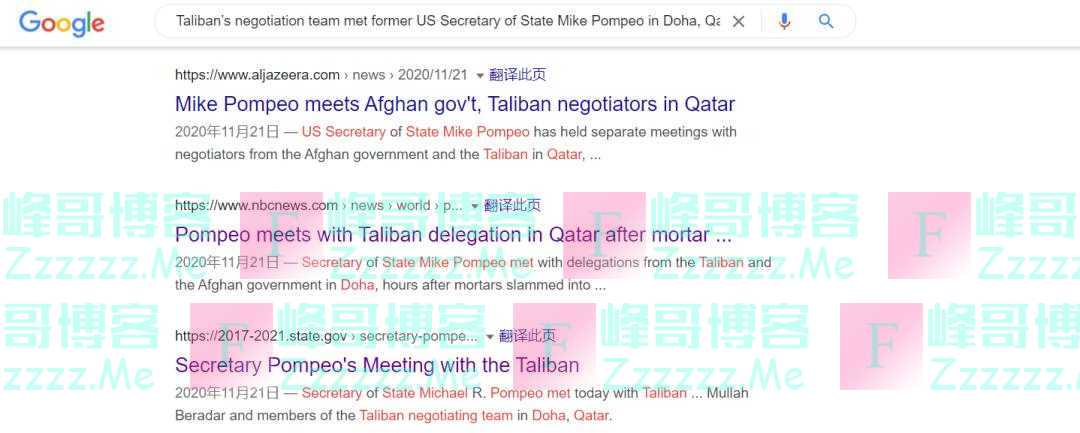 如果我们进一步在谷歌上搜索图说信息相关内容,则可以看到美国国务院网站和美国全国广播电视(NBC)对相关会面的记录或报道。NBC称,2020年11月21日,时任美国国务卿蓬佩奥 (Mike Pompeo)在卡塔尔和塔利班代表团见面,还就当天发生在喀布尔的迫击炮袭击一事向后者发起问询。报道中同样使用了上述瑟曼斯基拍摄的这张照片。