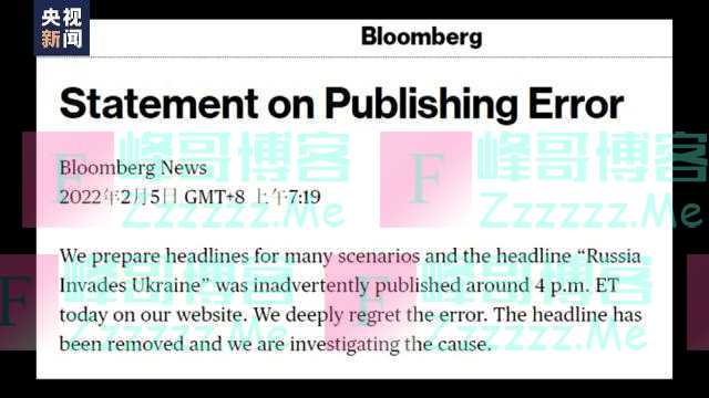 当地时间2月4日,美国彭博社在官网发布了一个足以震惊世界的标题——“俄罗斯入侵乌克兰”,大约半小时后标题就被删除了。彭博社在事后发布声明解释称,这是一个事先准备好的标题,是无意中发布的,对此深表遗憾。