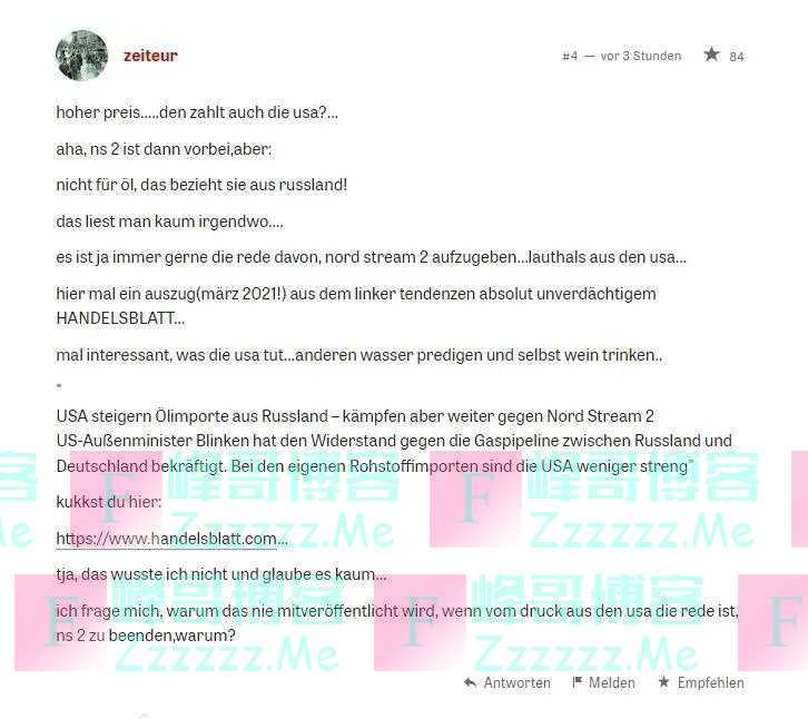 有一位读者则在留言中批评了美国为了本国利益双标,一面要求禁止德国与俄罗斯在北溪2号方面合作,一面自己从俄罗斯进口廉价的石油: