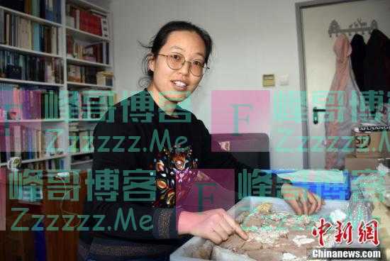 论文通讯作者兼第一作者、中科院古脊椎所副研究员董丽萍接受中新社记者采访,介绍李氏始祖巨蜥化石正型标本。 中新社记者 孙自法 摄