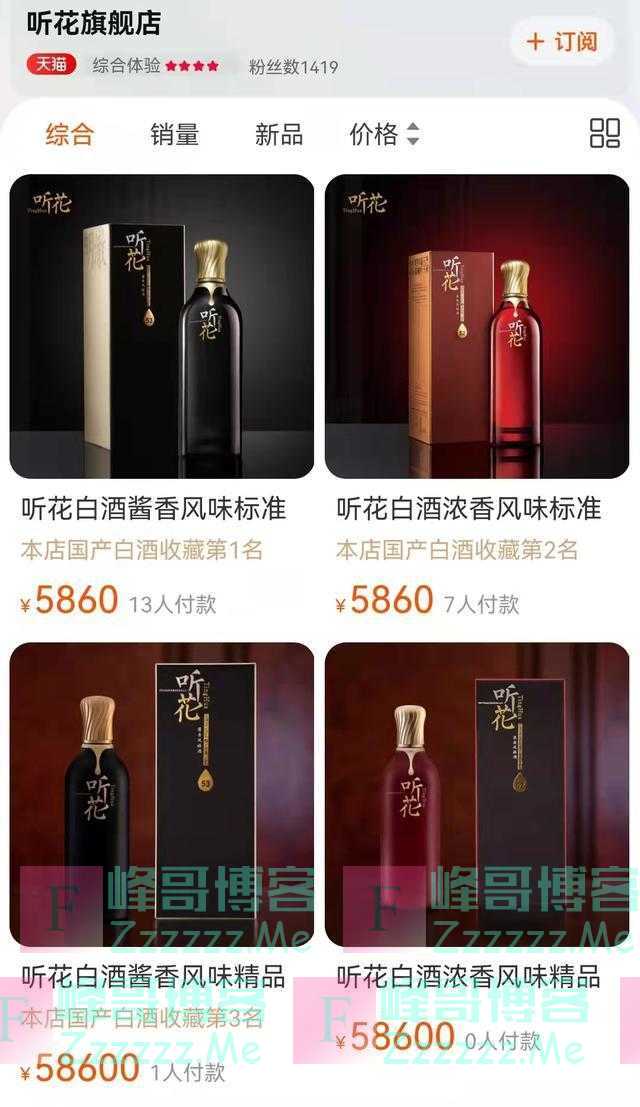 在听花酒线上旗舰店,52度750ml听花浓香风味白酒和53度听花酱香风味白酒标准装均定价5860元;52度750ml听花浓香风味白酒和53度听花酱香风味白酒精品装则定价58600元。
