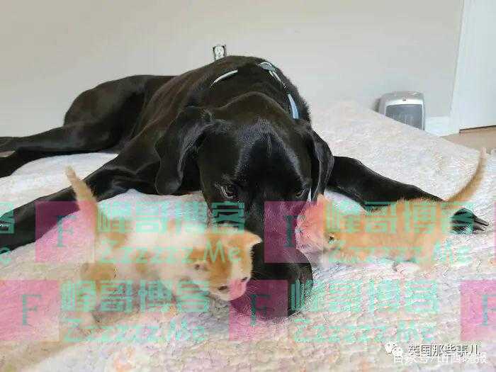 如今,大块头的狗狗,帮铲屎官照顾陪伴小奶猫。