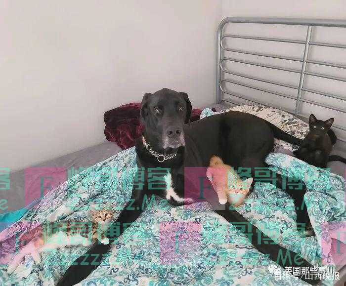 大丹犬Corbin不仅和小狗狗相处愉快,而且跟小奶猫也很搭。