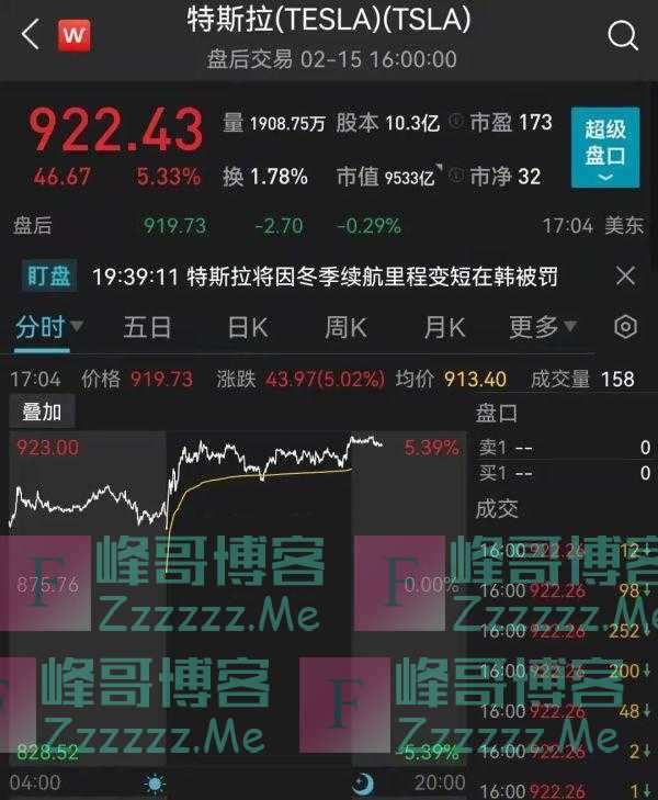 2022年开年至今,特斯拉股价经历小幅回落后于近期处于横盘震荡状态,截至2月15日收盘,报922.43美元,涨5.33%,最新市值超过9500亿美元。