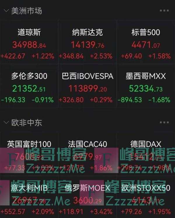 截至2月15日收盘,道指涨1.22%,报34988.84点;标普500指数涨1.58%,报4471.07点;纳指涨2.53%,14139.76点。欧洲主要股指上涨逾1%,英国富时100指数、法国CAC40指数、德国DAX指数隔夜分别上涨1.03%、1.86%、1.98%。