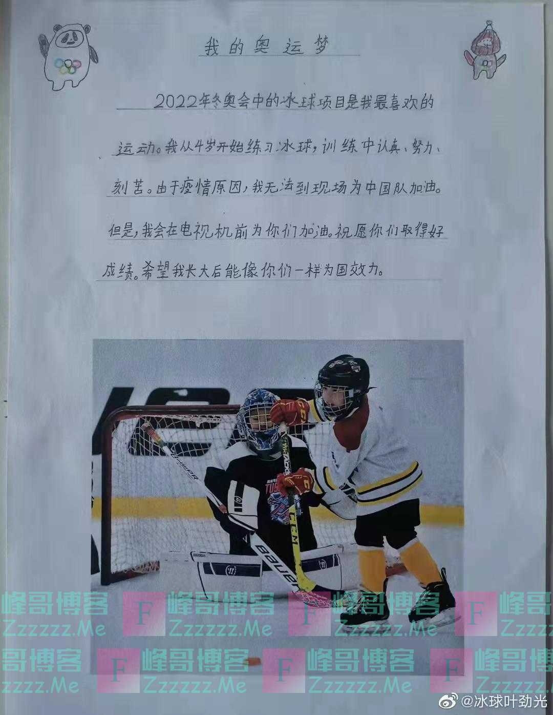 几天后,叶劲光晒出了一位小冰球运动员的手写信,配文道:“我们一起加油!”小朋友在信中写道:“祝愿你们取得好成绩,希望我长大后像你们一样为国效力。”