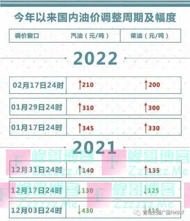 截至上次调价,汽油价格累计每吨上调865元,柴油价格累计每吨上调830元。