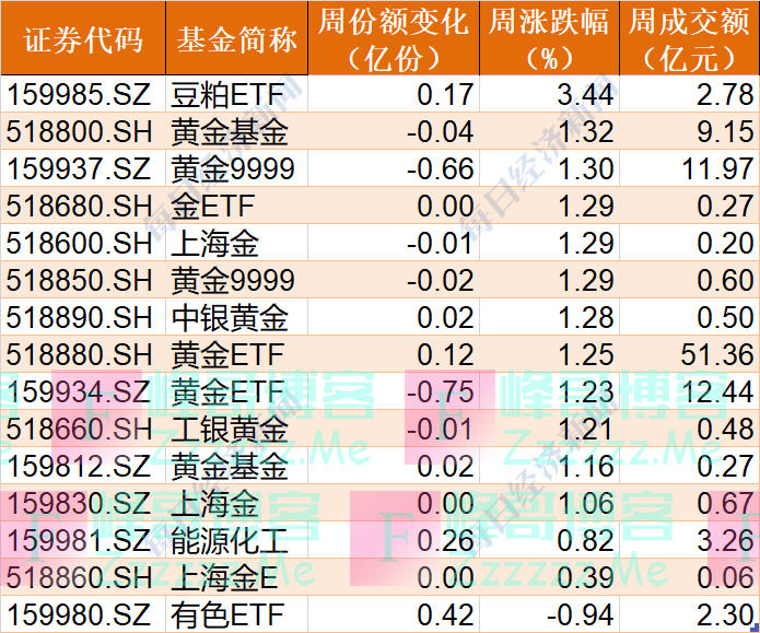 商品ETF本周除有色ETF下跌0.94%外,其余均实现上涨,豆粕ETF大涨3.44%,而黄金相关ETF普遍涨逾1%。