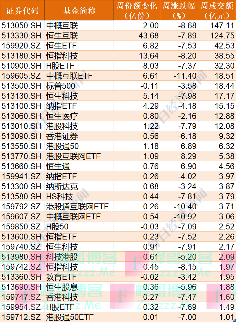 跨境ETF本周成交额超过1亿元的有30只,普遍出现调整,其中中概互联ETF、中概互联网ETF和港股通互联网ETF分别下跌了11.4%、10.92%和10.4%;份额上,恒生互联增加了43亿份。
