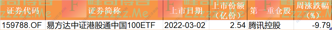 目前已有1只ETF披露下周上市,上市交易份额2.54亿份,跟踪标的为中证港股通中国100。