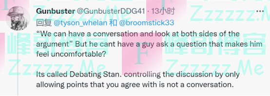 “‘我们可以进行一场对话,看看双方的争论’。但他就不能让人问一个让他觉得不舒服的问题吗?这是辩论,斯坦。只允许通过表达你同意的观点来控制讨论进程并不是对话。”