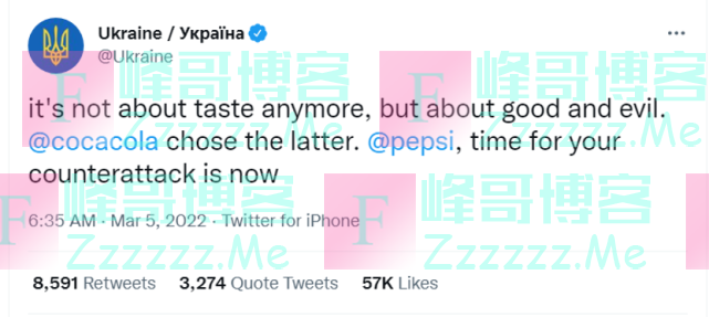 除了《基辅独立报》外,乌克兰国家形象官方推特账号也发文称:“选择什么可乐已经不再是口味问题,而是正邪之分”,随后他们还向百事可乐喊话说“可口可乐选择了邪恶,该轮到你们还击了”。