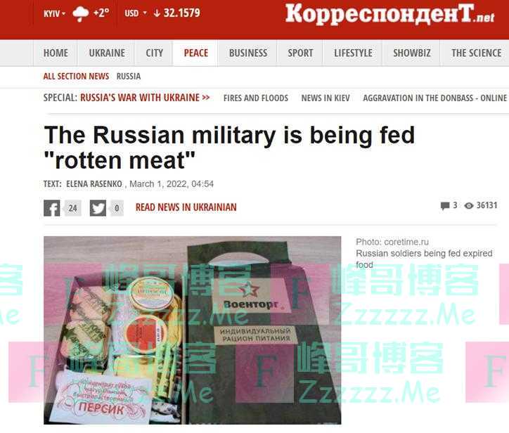 该链接指向的报道中使用了一张来自coretime.ru的图片,展示的是一份军粮的外包装和食物配给,包装上的红星标志和“Военторг”字样与网传视频中被称作俄军野外配给的军粮外包装图案颇为相像。