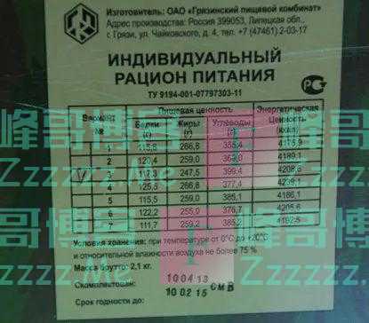 hamshenci在2014年购于俄罗斯境内的军粮。hamshenci在其旅行日记中事无巨细地记录下了这份军粮的外包装和内部组成。包装背面上两串分别被标注为生产日期和截止日期的数字“10 04 13”和“10 02 15”,与网传视频中乌克兰士兵展示的包装图片上的数字几乎一模一样,就连数字后印刷的字符“CMB”在字形结构、大小、排列位置和朝向上也是一致的。