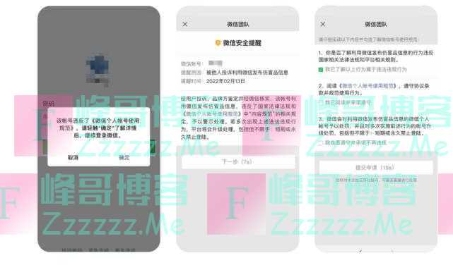 此外,微信团队在处置违规帐号的同时,也向用户下发教育页面,让用户学习、了解发布仿冒品信息行为的违规性,并通过系统流程要求违规帐号不再利用微信发布仿冒品信息,以实现教育效果。