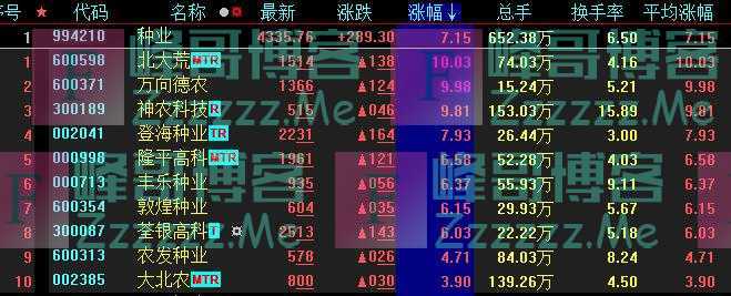 周一,农业股表现强劲,涨幅居前。截至收盘,种业(7.15%)、农林牧渔(5.05%)、水产养殖(4.13%)等细分板块纷纷上扬,表现抢眼。
