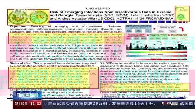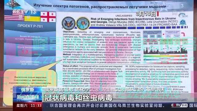 3月10日俄方再度发布消息说,经过对相关文件进一步分析,俄方发现,美方计划于2022年在乌克兰开展鸟类、蝙蝠及爬行动物病原体研究,并逐步转入研究这些动物携带非洲猪瘟和炭疽病毒的可能性,实验目的是“为致命病毒病原体的隐蔽传播建立机制”。
