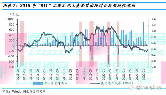 2)“811”汇改以来,权益市场上,外资出现过5次大幅流出。其中3次受外部短期冲击影响,冲击弱化后人民币快速回归基本面;其他两次,人民币持续贬值。其中2015年10月的贬值,发生在“811”汇改前人民币积蓄巨大贬值压力的背景下;2019年3月的贬值,发生在中美脱钩风险显著上升的背景下。