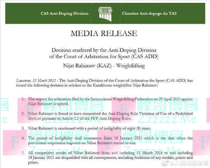 国际体育仲裁法庭日前宣布,2016里约奥运会男子举重77公斤级冠军哈萨克斯坦选手尼德札特·拉希莫夫因服用违禁药物将被禁赛8年,取消他从2016年3月15日到2021年1月18日所有比赛成绩。这意味着中国名将吕小军将递补获得里约奥运会该级别金牌, 从而实现奥运会三连冠!