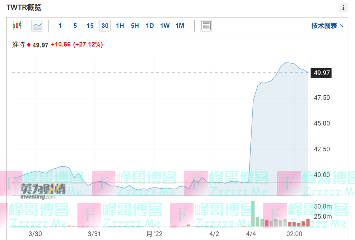 周一的拉升之后,推特市值由315亿美元飙升至400亿美元,一夜飙涨85亿美元。