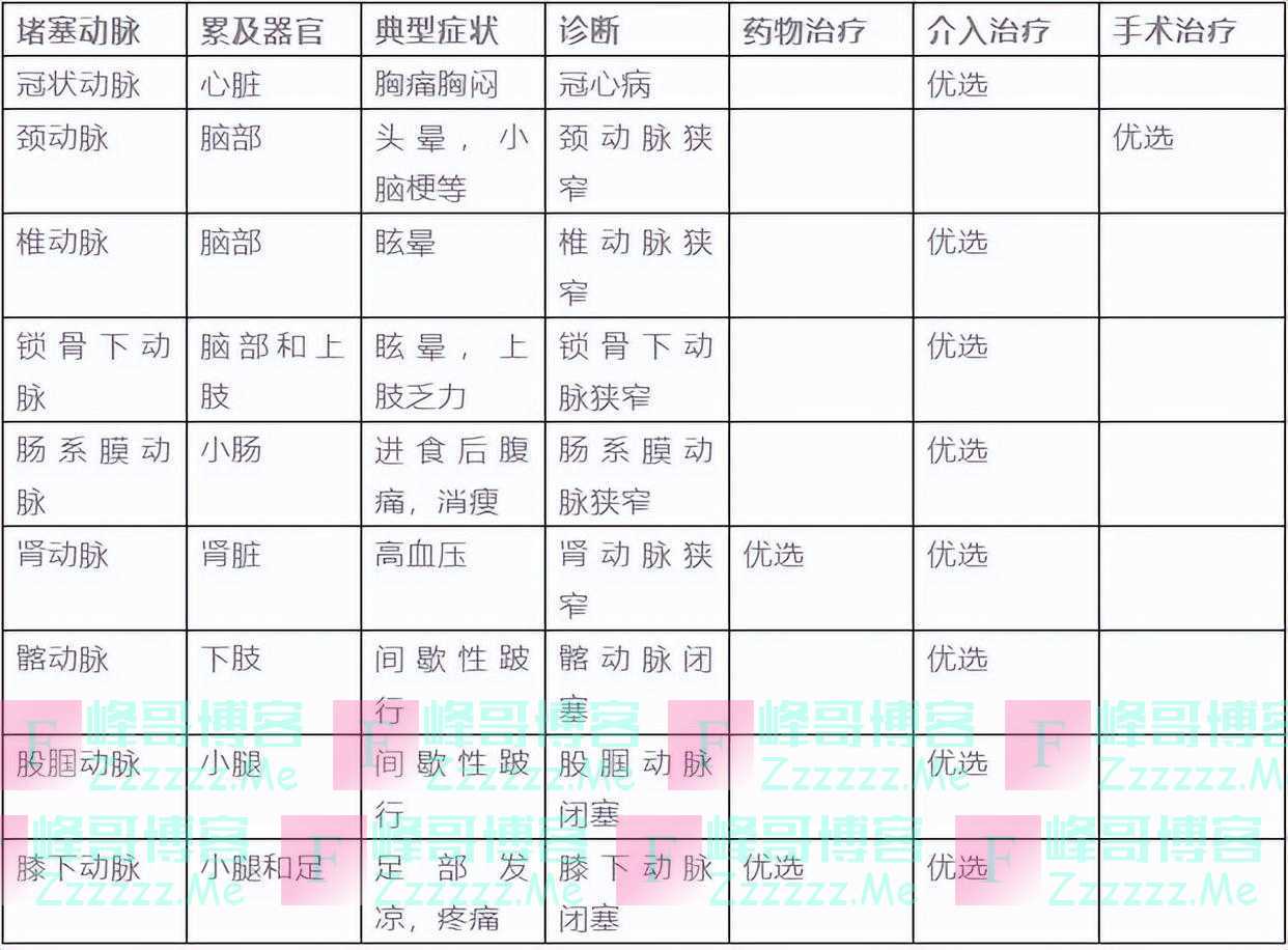 总的来说,每种疾病都有三大类治疗方式,分别是药物治疗,介入治疗和手术治疗,但更详细的内容还是要等医生根据个人情况,给出具体的治疗建议。下面一张表是常见的动脉血管堵塞的相关知识,大家可以对照了解。