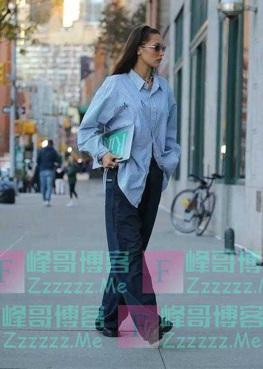 Bella Hadid用oversize的条纹衫搭配了同色系的阔腿裤,墨镜与发箍等配饰很好的提升了时髦度,真是把随性街头感拿捏的得心应手。