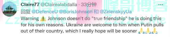 一位显示来自伦敦的网友表示,“在国内我不是约翰逊的粉丝,但(对他)在基辅向他脱帽致敬,因为他代表着英国人民对乌克兰人民和他们自决权的支持!”↓