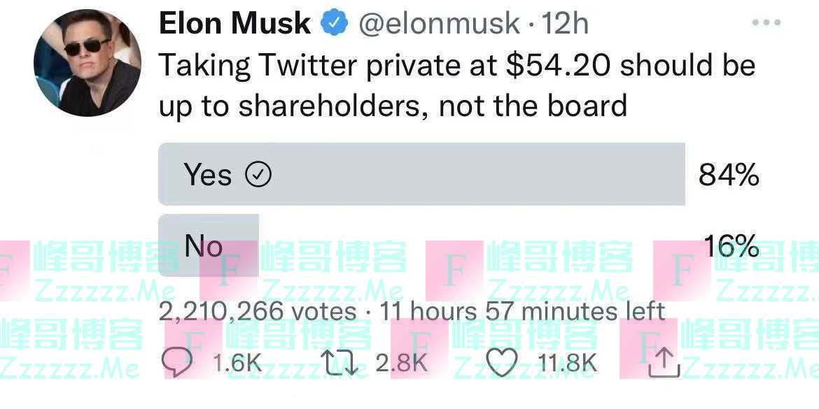 14日,马斯克在个人推特上发起“是否同意推特私有化取决于个人股东,而非董事会”的投票,截至15日,有84%的用户选择同意。