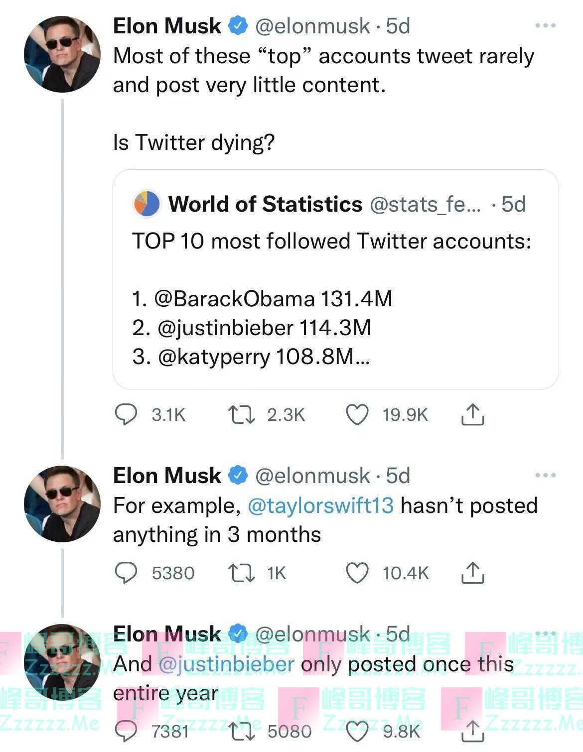 对于这样的排名,马斯克提出质疑:9日,他转发排行榜并配文称,“那些粉丝数量数一数二的账号却发布很少的推文,比如泰勒·斯威夫特近三个月什么都没发布却有1.08亿粉丝,贾斯汀·比伯一整年只发布了一条推文,却收获了1.14亿粉丝量。推特正在死亡吗”?