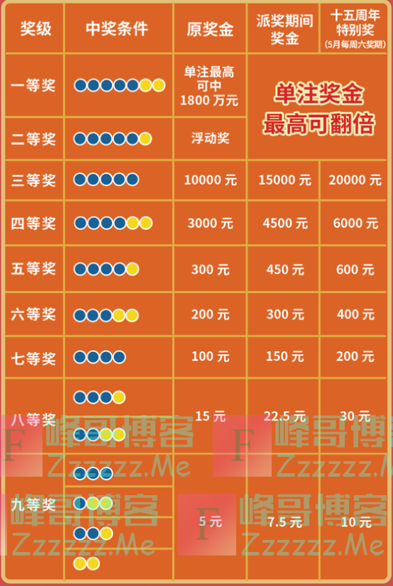 十五周年特别奖专项用于5月每周六奖期,即第22050、22053、22056、22059期,每期1000万元,与固定奖派奖合并派发且优先使用,当期三至九等奖单注派奖奖金为当期对应奖级单注奖金的100%,也就是说,届时固定奖单注奖金也可以实现翻倍,更大力度普惠大众,让更多购彩者享受派奖的乐趣。