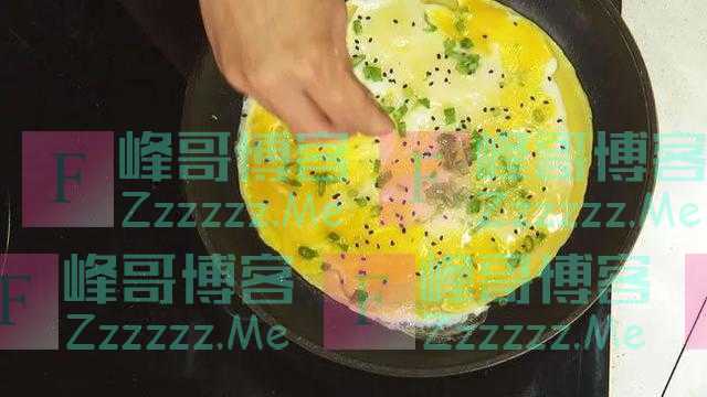 锅底刷油,小火倒入饼糊,饼糊成型后,打入鸡蛋、撒上芝麻、葱花、香菜,翻面摊制。