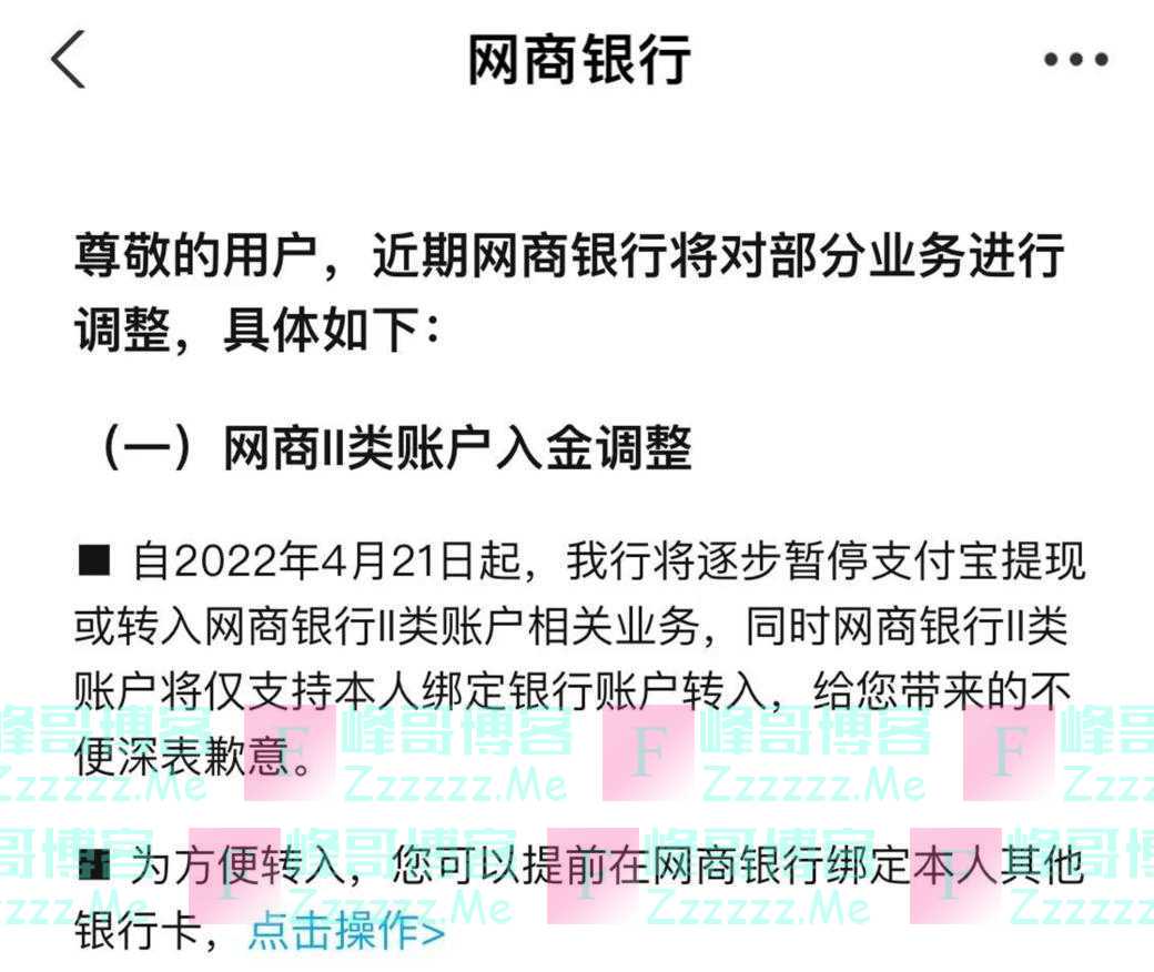 记者在网商银行小程序留意到,近日平台发布一则关于“网商银行Ⅱ类账户相关业务调整及福利金升级公告”。公告称,自2022年4月21日起,网商银行将逐步暂停支付宝提现或转入网商银行Ⅱ类账户相关业务,同时网商银行Ⅱ类账户将仅支持本人绑定银行账户转入。