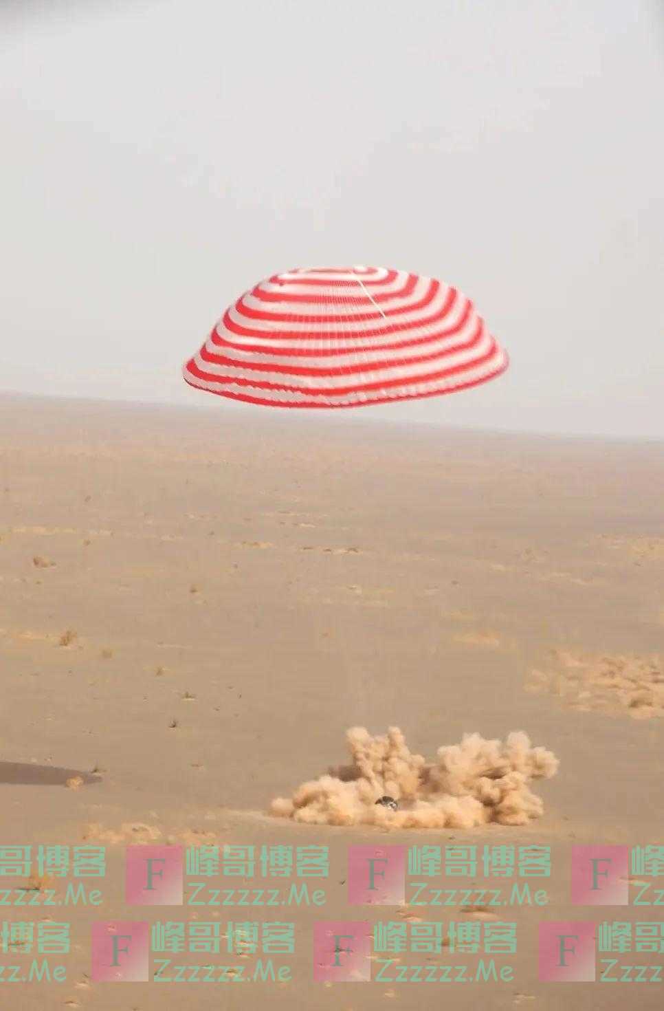 本文转自【中国载人航天】; 返回舱主降落伞打开后缓缓降落
