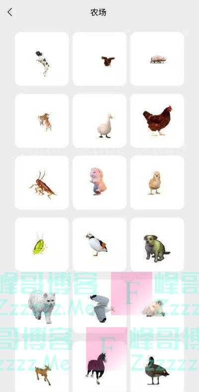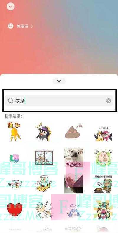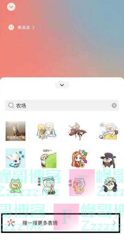 随后点击“放大镜”图标,搜索“农场”,拖拽到最下方点击“搜一搜更多表情”,然后就能看到一堆可爱的小动物啦。