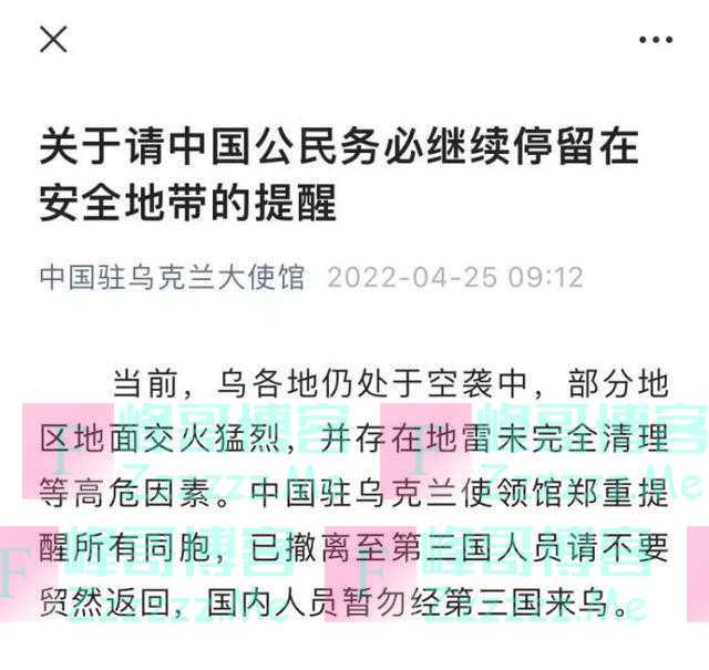 北京时间4月25日,中国驻乌克兰大使馆发布关于请中国公民务必继续停留在安全地带的提醒。