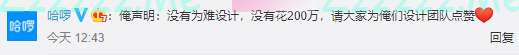 随后,又在评论区回复网友:“没有为难设计,没有花200万。”