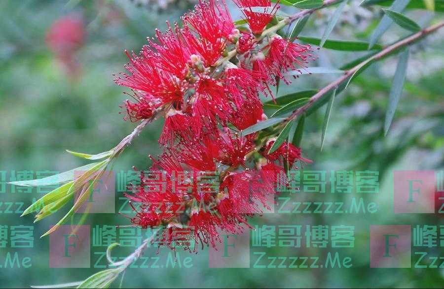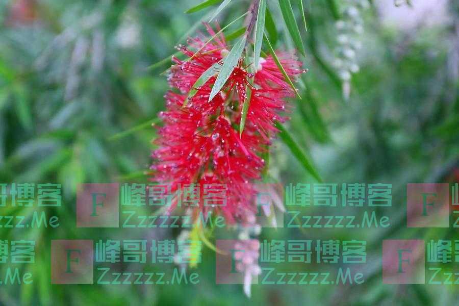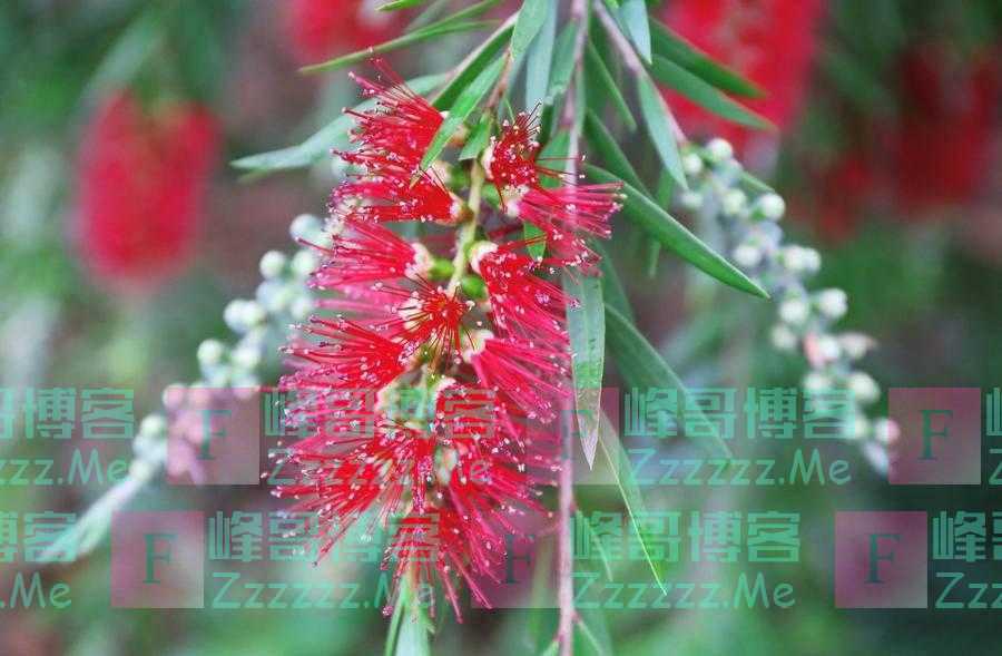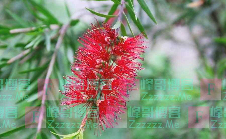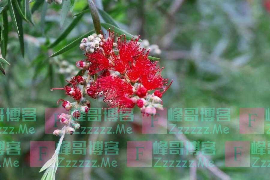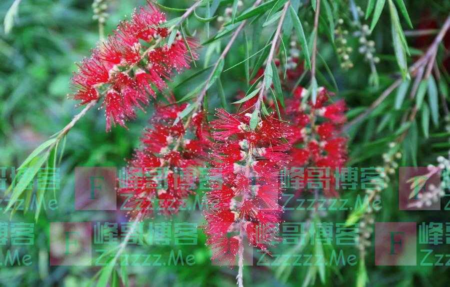 在垂直红千层的枝条上,一串串如火焰般红红的穗状花,非常惹人眼球,忍不住驻足欣赏。