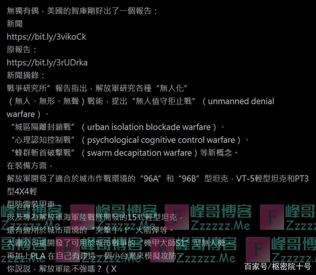 在台湾PTT论坛上,台湾网友将这一美国智库报告与台军方罕见坦承:共军三军战力优于台湾的新闻,放在一起来讨论的。这篇帖子还在最后直言“解放军能不强吗”?
