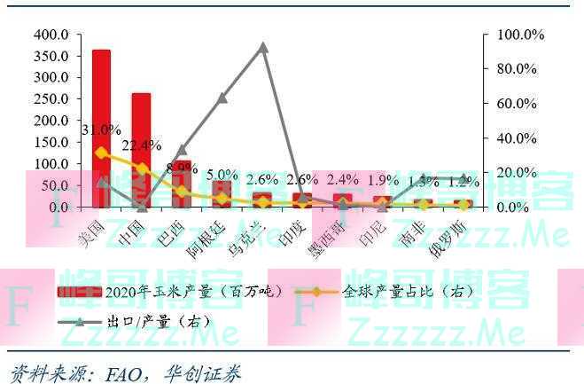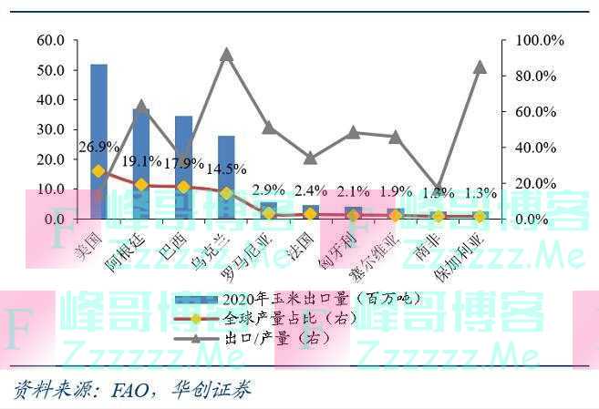 乌克兰是全球主要玉米生产国和出口国。2020年全球玉米产量约11.62亿吨,乌克兰产量占比约2.6%;全球玉米出口量约1.93亿吨,乌克兰的出口占比是14.5%。此外,乌克兰的玉米贸易外向度在主要出口国家中是最高的,其玉米出口量占国内产量的比重达到92.3%。