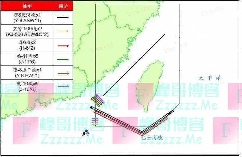 报道根据广播及航迹记录声称,“共机”8时20分、8时37分、8时43分、8时51分、8时55分、9时09分、9时25分、9时35分、9时36分、10时15分、10时45分、10时47分、11时43分、12时47分、13时09分、15时36分16度进入台“ADIZ”(西南空域及东南),高度6000米,台空军宣称“在空警戒并广播驱离”。