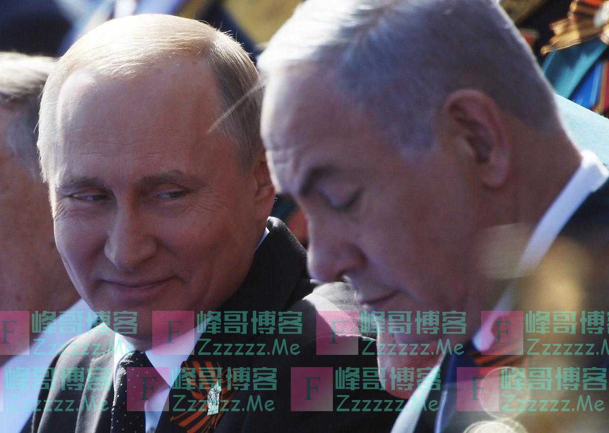 2018年5月9日,在俄罗斯莫斯科红场参加胜利日阅兵式上,俄罗斯总统弗拉基米尔·普京(左)和以色列总理本雅明·内塔尼亚胡(右)交谈。2019年
