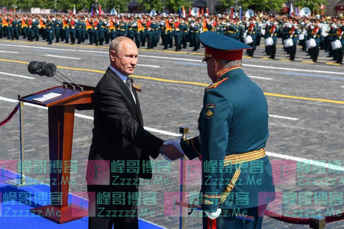 当地时间2020年6月24日,俄罗斯莫斯科,俄罗斯总统弗拉基米尔·普京(左)和国防部长谢尔盖·绍伊古在红场胜利日阅兵式上握手。2021年